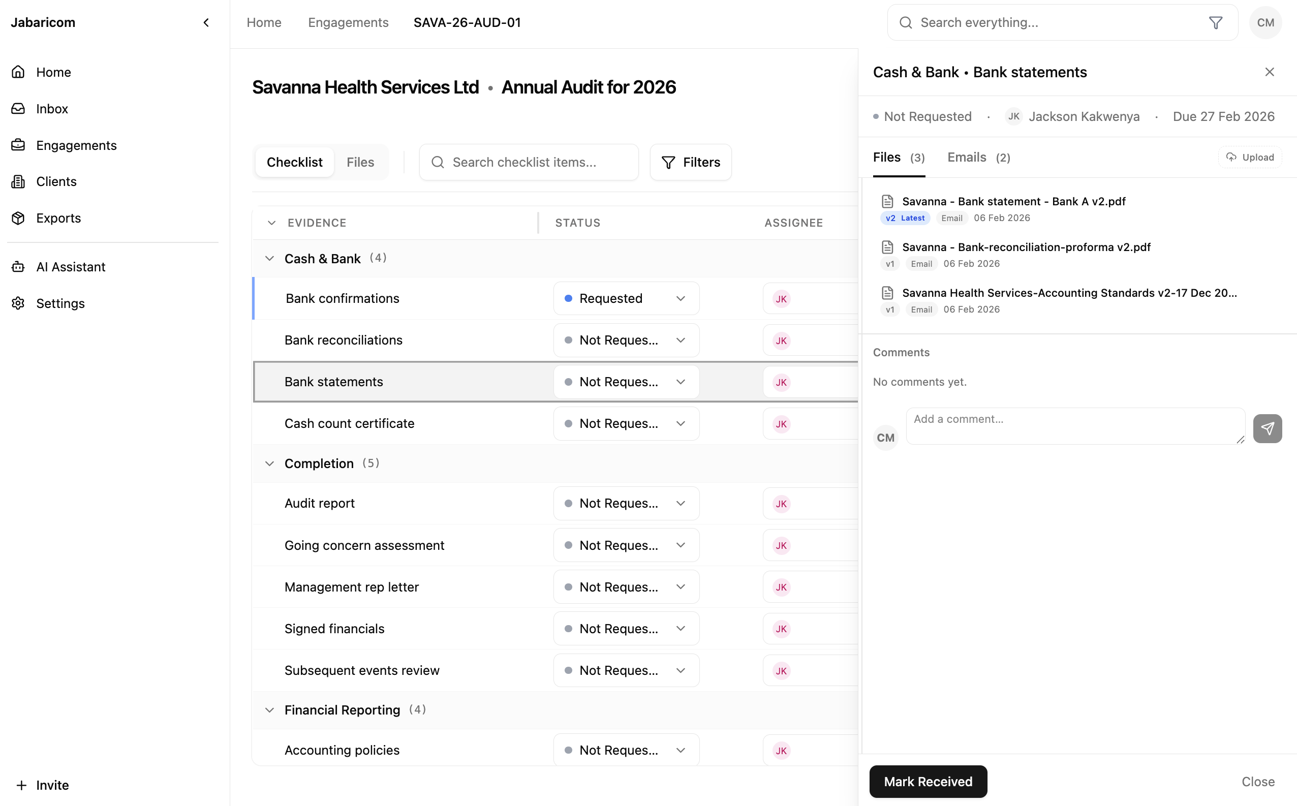 Email arrives with bank reconciliation. File it to "Cash & Bank Evidence" with one click. Now it's connected to the engagement, timestamped, searchable. Three months later when the partner asks, you find it in 10 seconds.